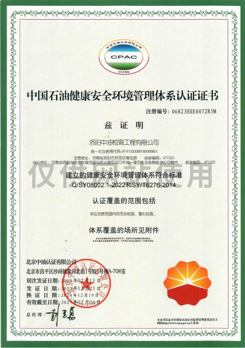 為確保洛陽中油檢測工程有限公司在實施檢測活動過程中,保持機構的獨立性,保障檢測過程及其結果的公正性和客戶信息的保密性,持續滿足CNAS-CL01及其在相關領域應用要求、《檢驗檢測機構資質認定管理辦法》、《檢驗檢測機構資質認定評審準則》、TSG Z7002-2022等CNAS認可規范文件、檢驗檢測機構資質認定文件、特種設備安全技術規范的要求,做出如下聲明承諾: