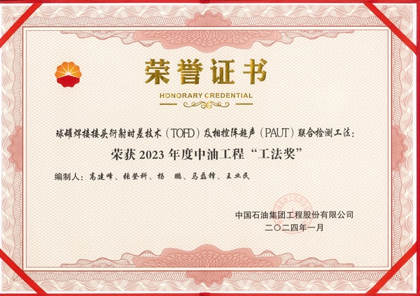 《球罐焊接接頭衍射時差技術(TOFD)及相控陣超聲(PAUT)聯合檢測工法》在2023年10月已經被中國石油工程建設協會評定為石油工程建設工法(省部級),本次該工法被評為中油工程2023年度工法獎,是對公司工法質量的高度認可,同樣也是激勵工法編制人員,檢測技術人員要善于總結技術成果,不斷提升技術水平。